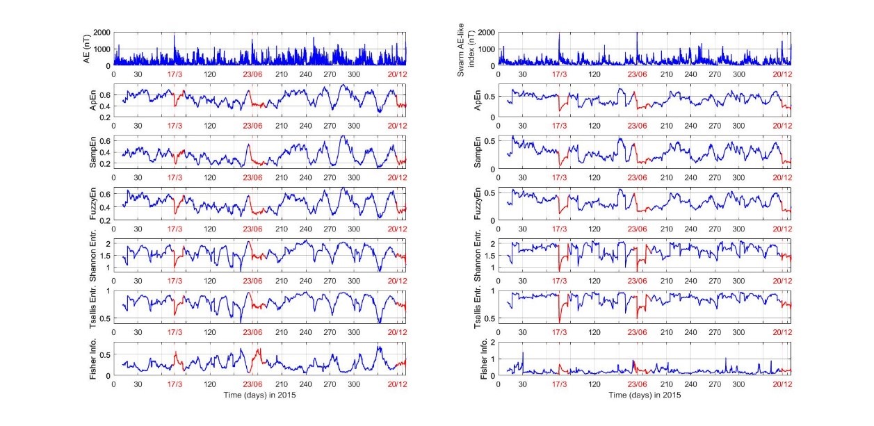 | INTENS_SwarmA_2015_AE-like_Entropies.JPG INTENS_SwarmA_2015_AE-like_Entropies.ZIP | Entropy measures (ApEn, SampEn, FuzzyEn, Shannon, Tsallis) and Fischer Information measure for Swarm AE-like index. The ASCII files "01" contain the timeseries, either of official AE index or of the derived AE-like index. |