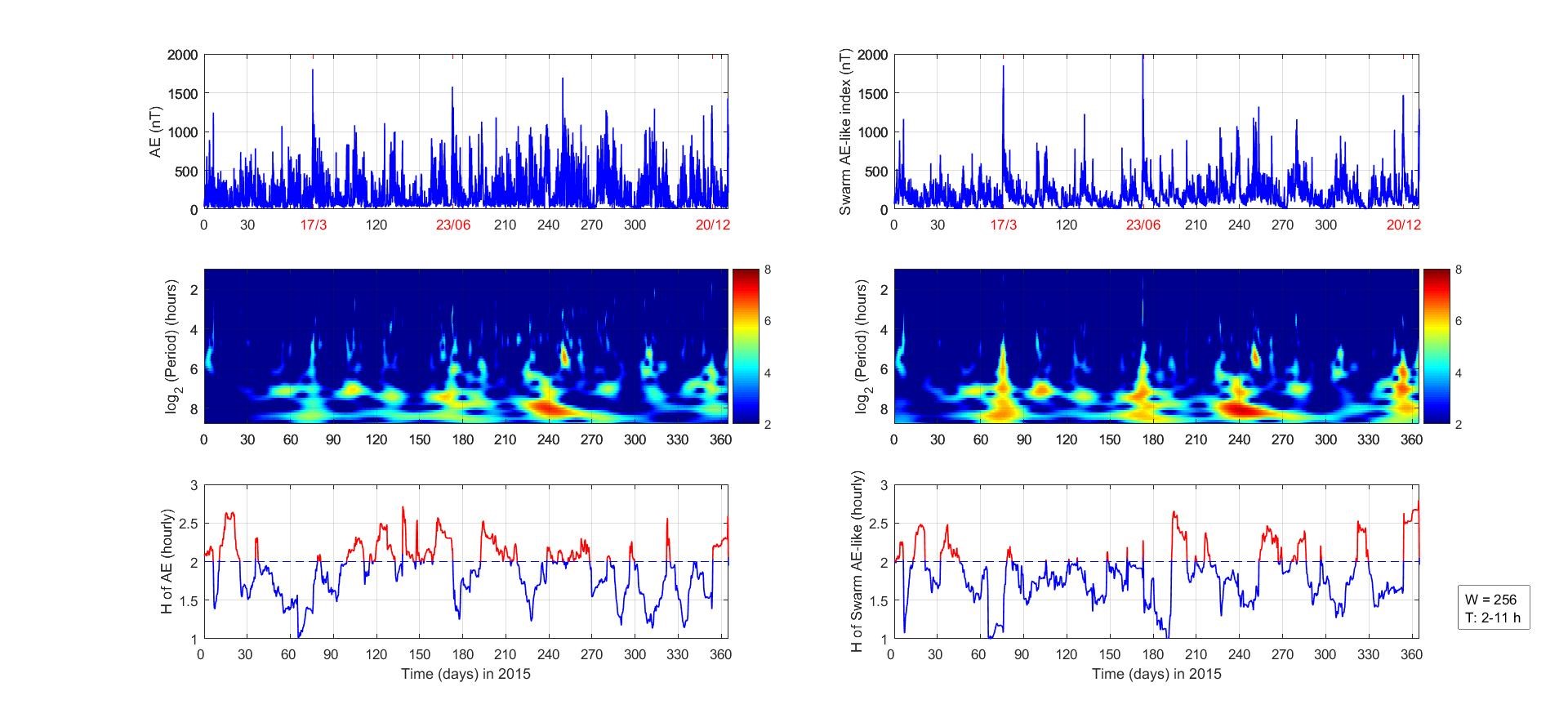 | INTENS_SwarmA_2015_AE-like_Wavelets_Hurst.JPG INTENS_SwarmA_2015_AE-like_Wavelets_Hurst.ZIP | Wavelet spectral analysis & temporal variation of the H index, for Swarm AE-like index, for the entire 2015. The ASCII files "01" contain the timeseries, either of official AE index or of the derived AE-like index; the ASCII files "02" contain the Wavelet data either of official AE index or of the derived AE-like index: "02_Wavelet_matrix" are 8760rows x 69columns matrices, in which the rows are the hours of the year, the first four columns characterize the timestamp (year, month, day, hour), and the remaining 65 are the Wavelet energy values corresponding to 65 periods, whose values are listed in the "02_Wavelet_period" files; the ASCII files "03" contain the Hurst index calculated either from the official AE index or from the derived AE-like index. |