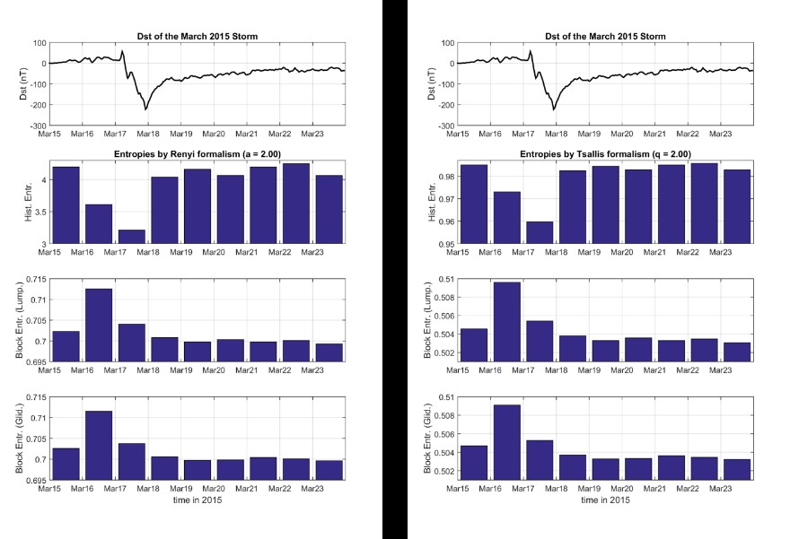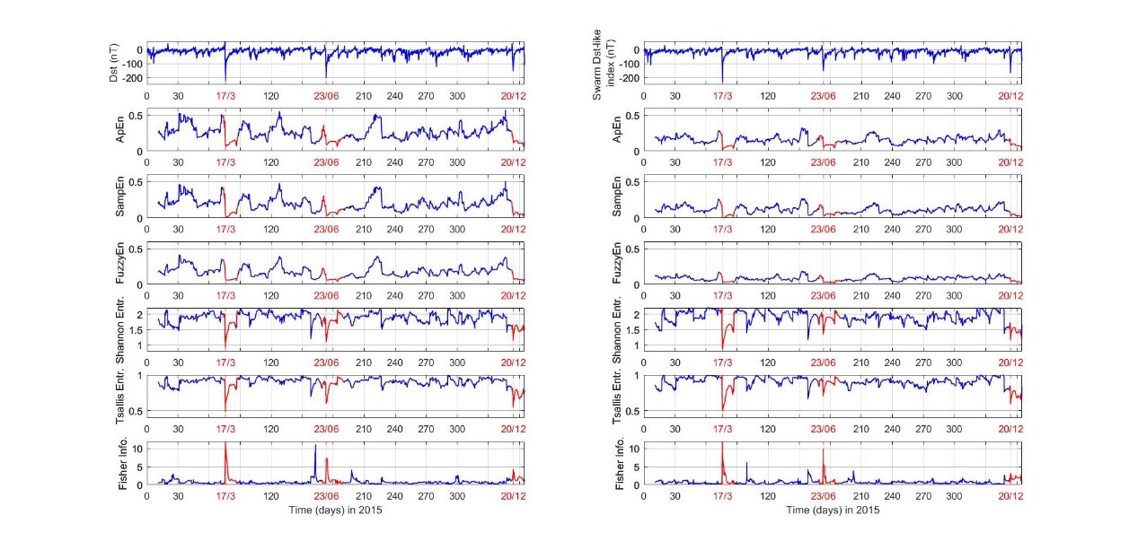 Each figure corresponds to the results for a given index / component (Dst or AE / Total field, Bpar, Bper1, Bper2), a given geomagnetic storm event (March, June) or the entire year 2015. Therefore, for example, the file "INTENS_SwarmA_2015_Dst-like_Entropies.pdf" will contain 7 plots, grouped in one column, displaying the 2015 Dst-index time series, the Approximate Entropy (ApEn), Sample Entropy (SampEn), Fuzzy Entropy (FuzzyEn), Shannon Entropy, Tsallis Entropy and Fisher Information measure.