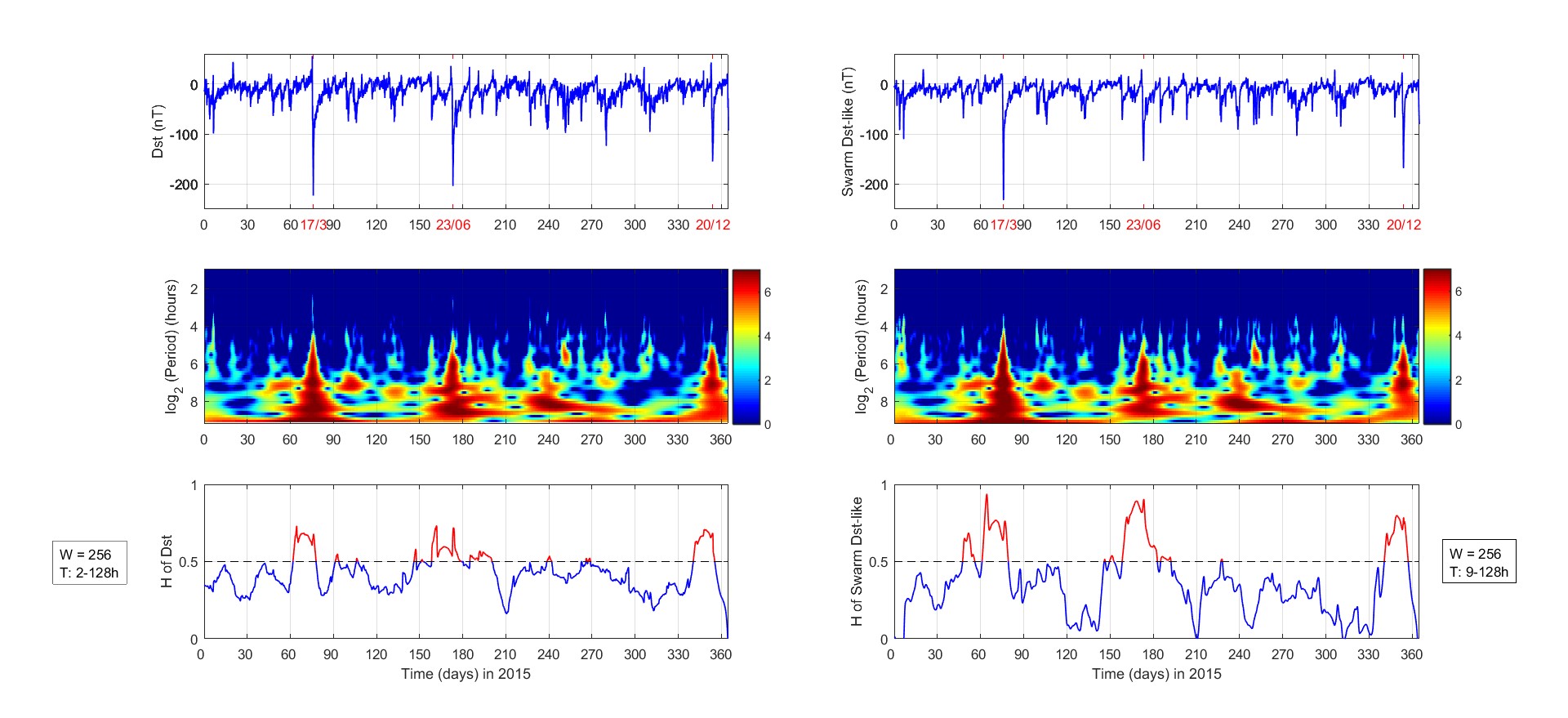 | INTENS_SwarmA_2015_Dst-like_Wavelets_Hurst.JPG INTENS_SwarmA_2015_Dst-like_Wavelets_Hurst.ZIP | Wavelet spectral analysis & temporal variation of the H index, for Swarm Dst-like index, for the entire 2015. The ASCII files "01" contain the timeseries, either of official Dst index or of the derived Dst-like index; the ASCII files "02" contain the Wavelet data either of official Dst index or of the derived Dst-like index: "02_Wavelet_matrix" are 8760rows x 69columns matrices, in which the rows are the hours of the year, the first four columns characterize the timestamp (year, month, day, hour), and the remaining 65 are the Wavelet energy values corresponding to 65 periods, whose values are listed in the "02_Wavelet_period" files; the ASCII files "03" contain the Hurst index calculated either from the official Dst index or from the derived Dst-like index. |