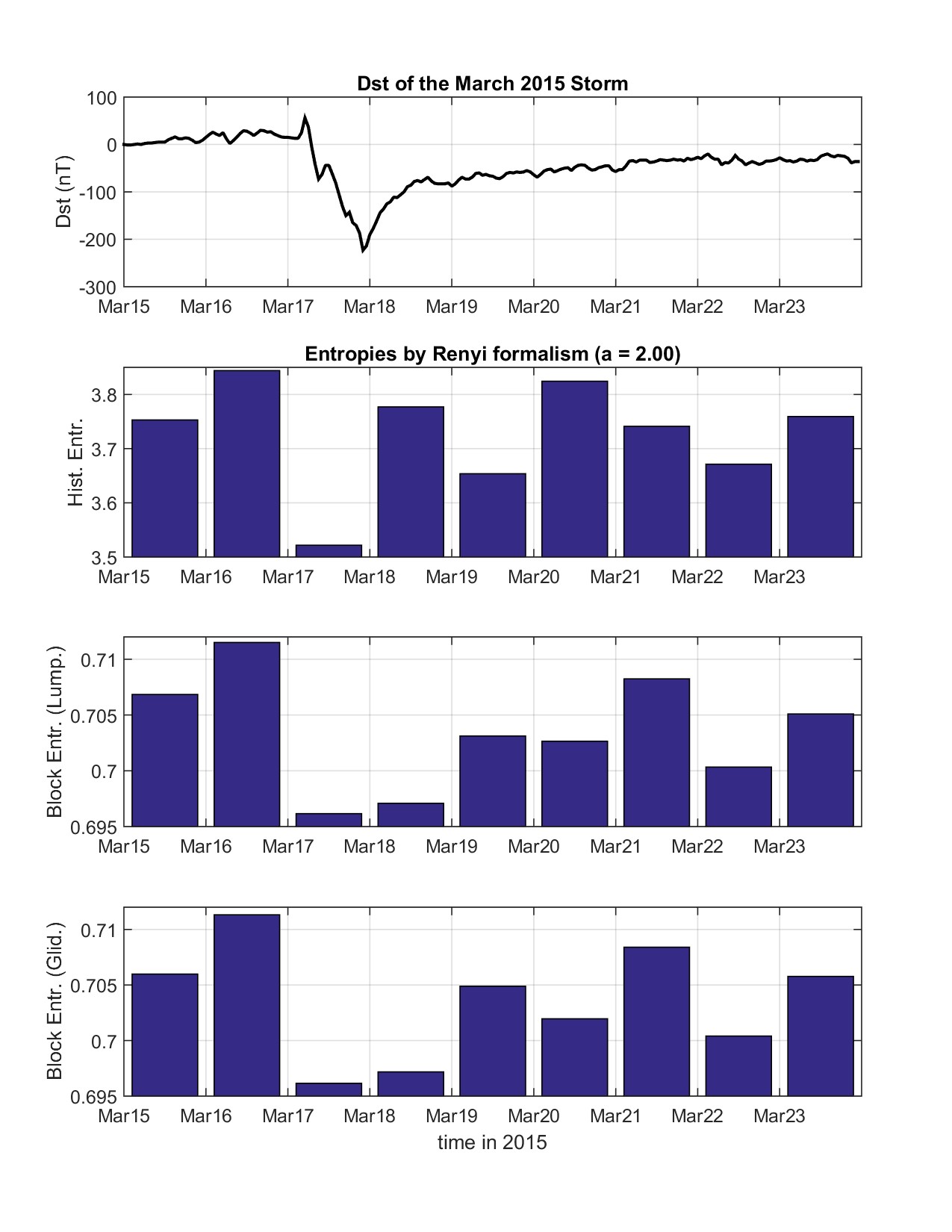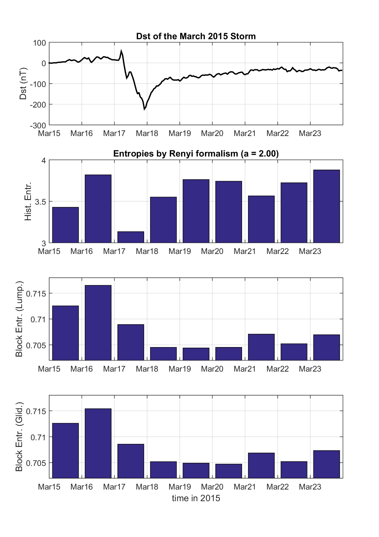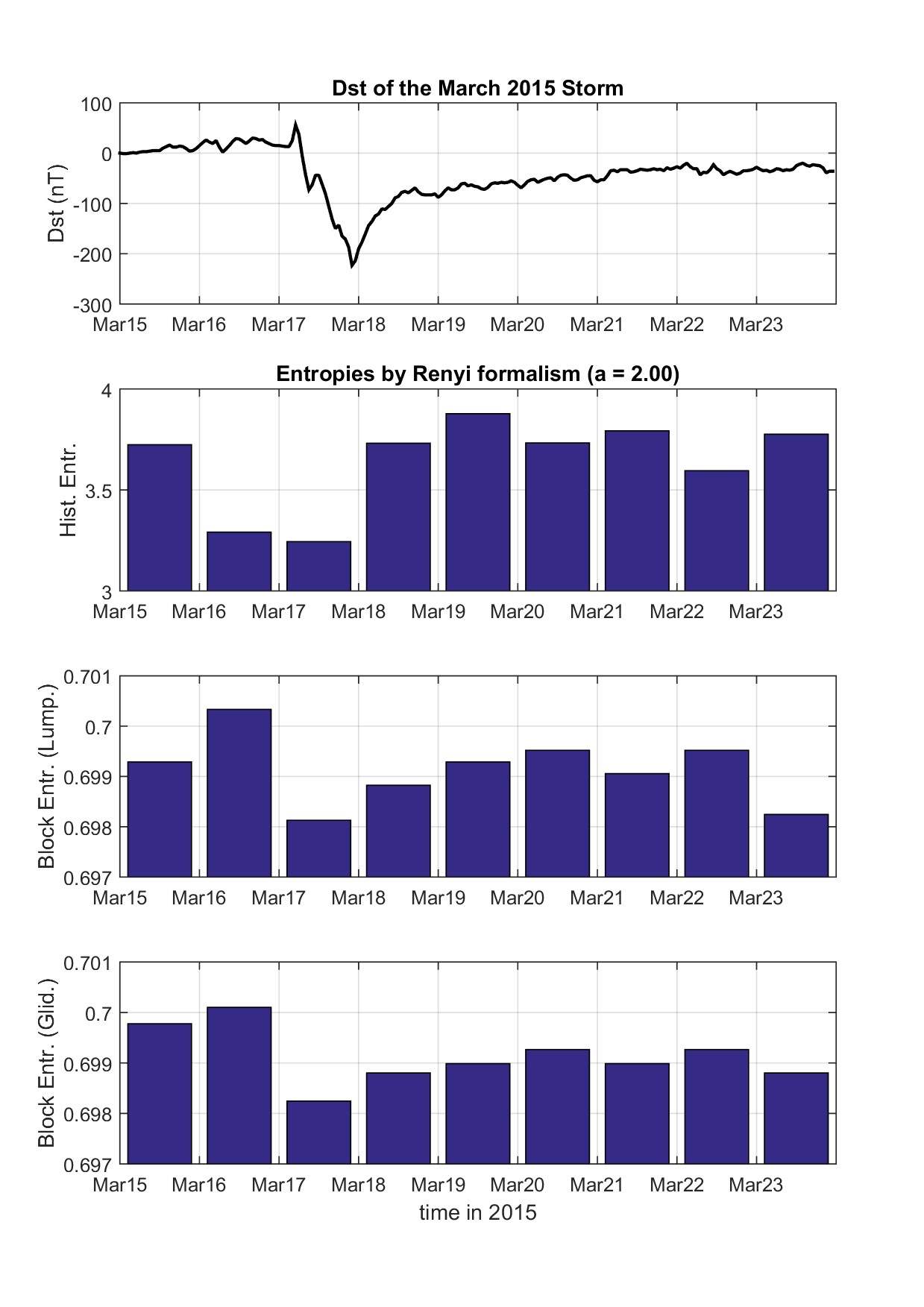 | INTENS_SwarmA_Storm2_AE-like_Renyi.JPG INTENS_SwarmA_Storm2_AE-like_Renyi.ZIP | Entropy Analysis according to the Renyi formalism of the Swarm A Index for the March 2015 Magnetic Storm. The ASCII file "01" contains the timeseries of the Swarm A AE-like index during the time interval which characterizes Storm N. 2.; ASCII files from "02" to "04" contain the daily averaged values of Renyi Entropy and Block entropies associated to the AE-like index. |