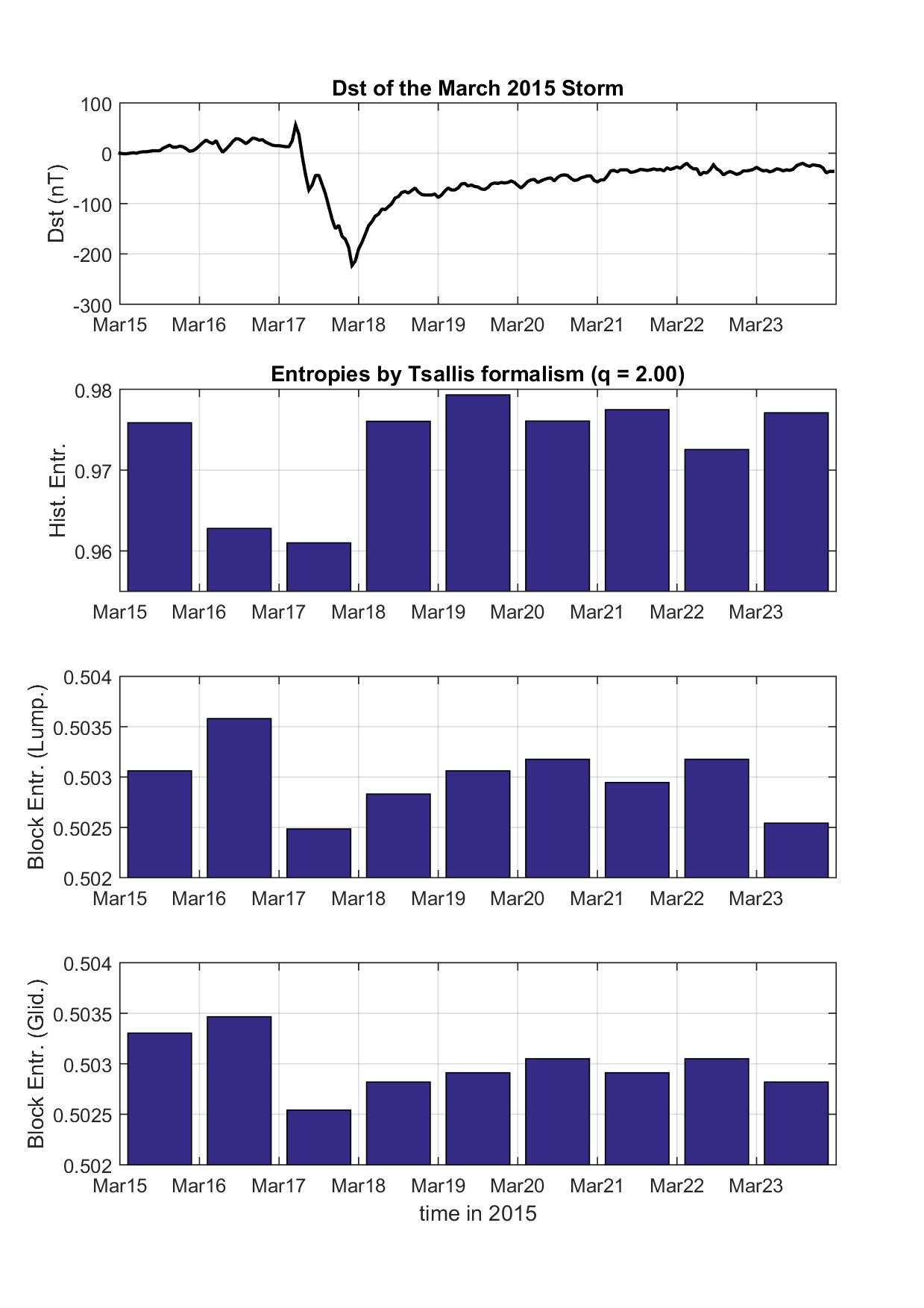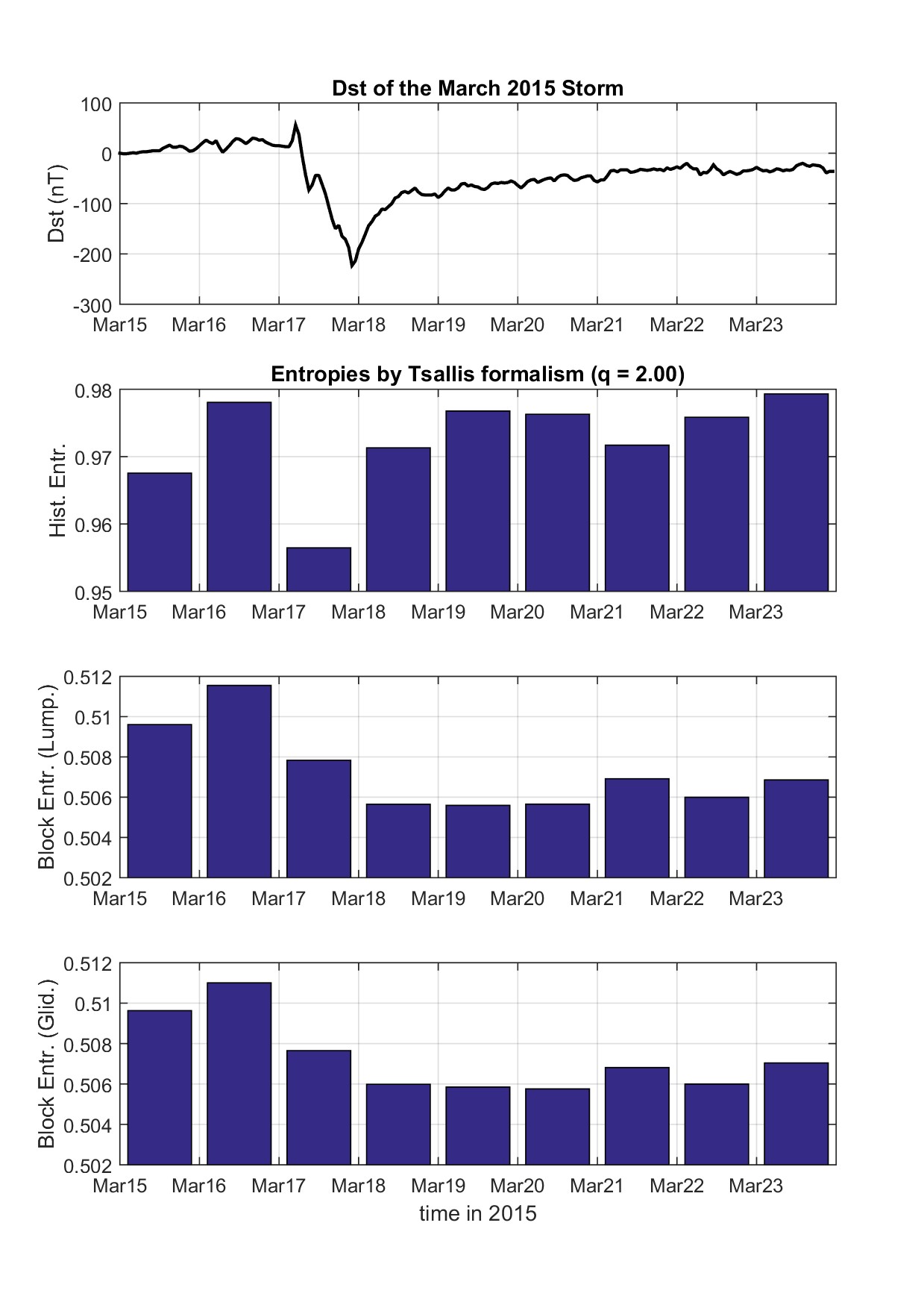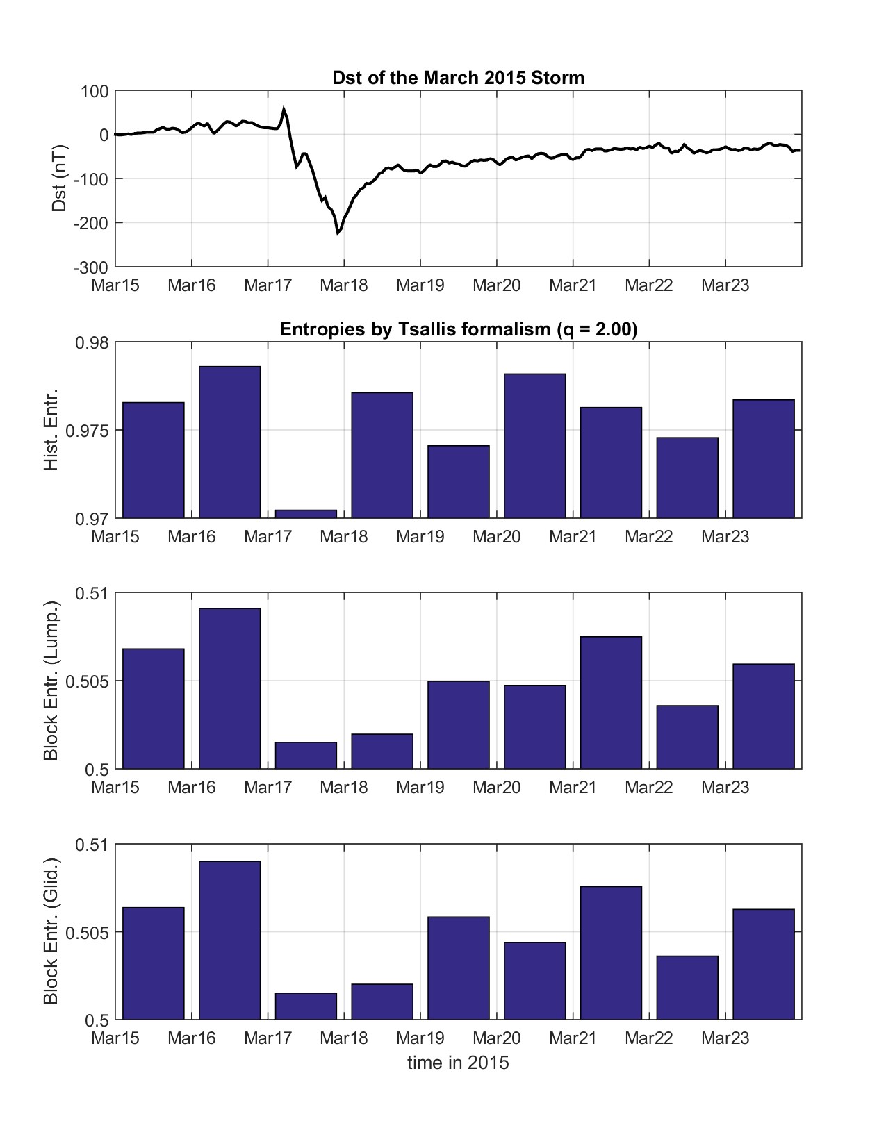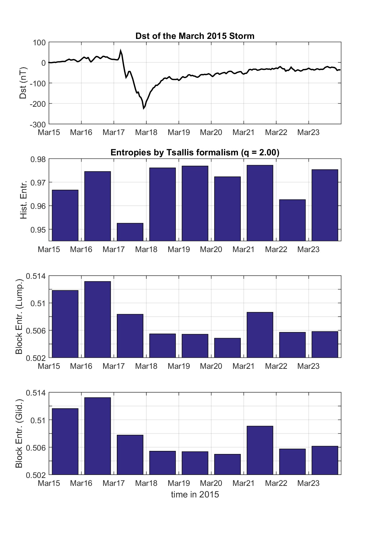 | INTENS_SwarmA_Storm2_Bpar_Tsallis.JPG INTENS_SwarmA_Storm2_Bpar_Tsallis.ZIP | Entropy Analysis according to the Tsallis formalism of the Swarm A Bpar for the March 2015 Magnetic Storm. The ASCII file "01" contains the timeseries of the official Dst hourly index during the time interval which characterizes Storm N. 2.; ASCII files from "02" to "04" contain the daily averaged values of Tsallis Entropy and Block entropies associated to the Swarm A Bpar component. |