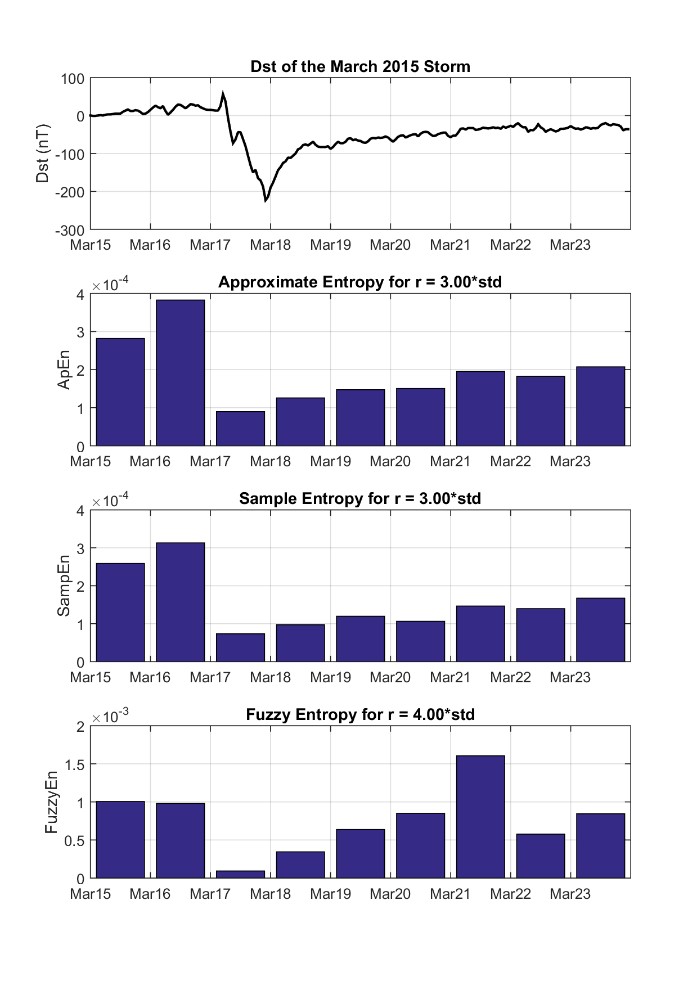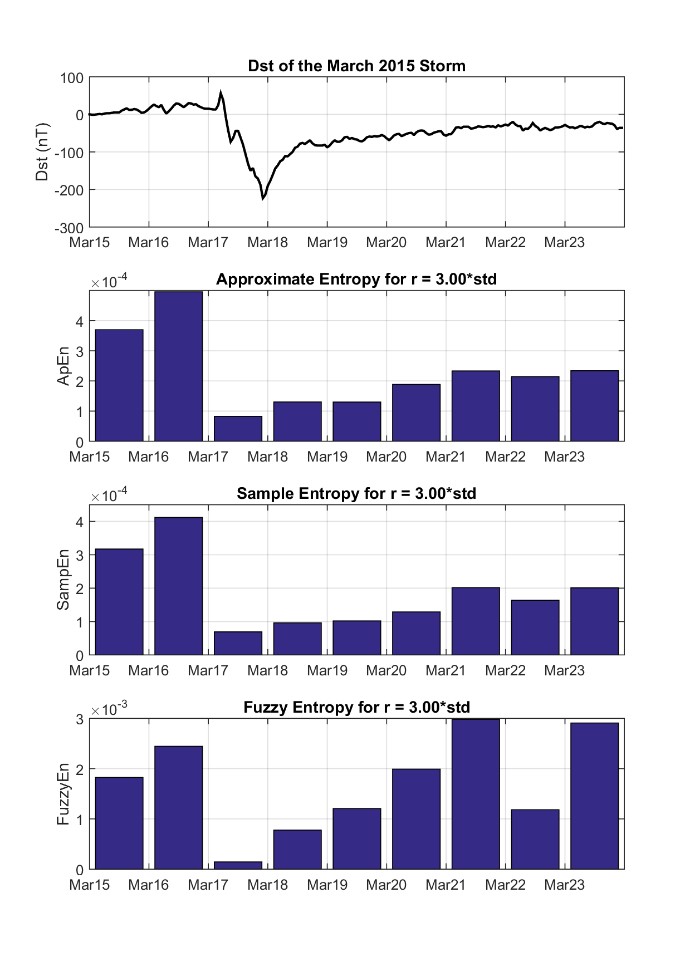| INTENS_SwarmA_Storm2_Dst-like_Ap_Samp_Fuzzy.JPG INTENS_SwarmA_Storm2_Dst-like_Ap_Samp_Fuzzy.ZIP | Entropy Analysis according to the Approximate, Sample and Fuzzy Entropy formalisms of the Swarm A Index for the March 2015 Magnetic Storm. The ASCII file "01" contains the timeseries of the Swarm A Dst-like index during the time interval which characterizes Storm N. 2.; ASCII files from "02" to "04" contain the daily averaged values of Approximate, Sample, and Fuzzy Entropy associated to the Dst-like index. |