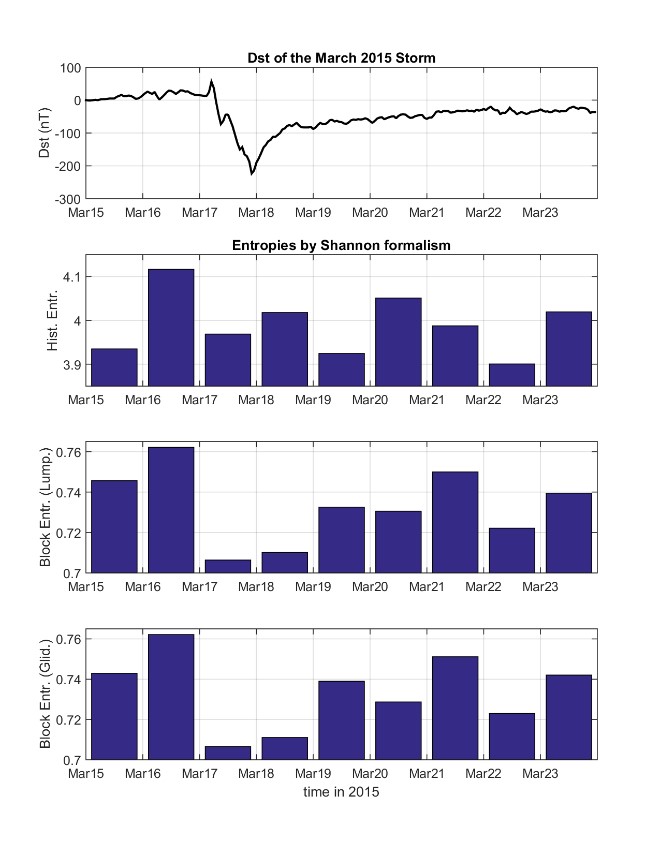 | INTENS_SwarmA_Storm2_Dst-like_Shannon.JPG INTENS_SwarmA_Storm2_Dst-like_Shannon.ZIP | Entropy Analysis of the Swarm A Dst-like Index for the March 2015 Magnetic Storm. The ASCII file "01" contains the timeseries of the Swarm A Dst-like index during the time interval which characterizes Storm N. 2.; ASCII files from "02" to "04" contain the daily averaged values of Shannon Entropy and Block entropies associated to the Dst-like index. |