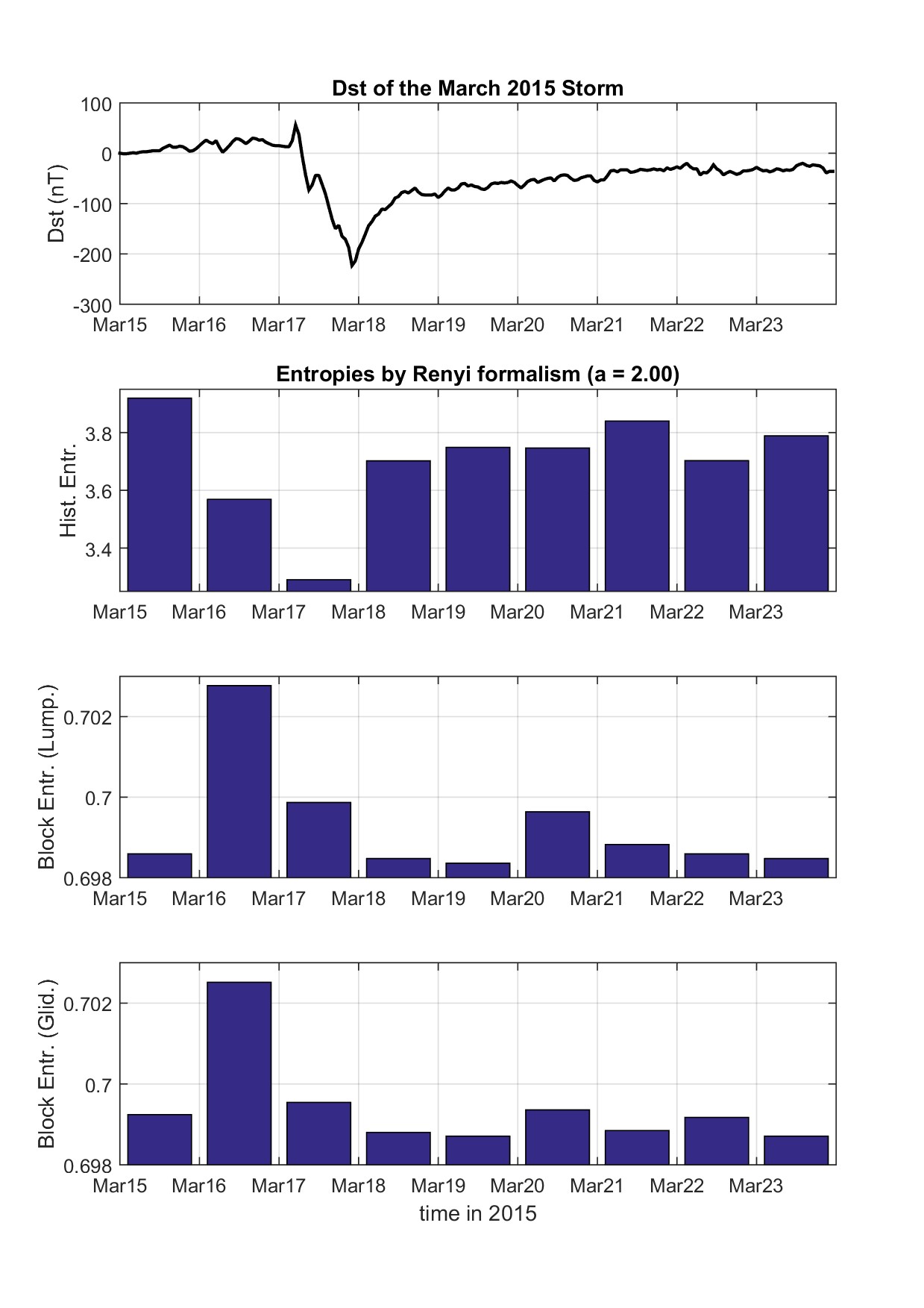 | INTENS_SwarmA_Storm2_Bper2_Renyi_Tsallis.JPG INTENS_SwarmA_Storm2_Bper2_Renyi_Tsallis.ZIP | Entropy Analysis according to the Renyi and Tsallis formalisms of the Swarm A Bper2 for the March 2015 Magnetic Storm. The ASCII file "01" contains the timeseries of the official Dst hourly index during the time interval which characterizes Storm N. 2.; ASCII files from "02_sin(dx)" to "04_sin(dx)" contain the daily averaged values of Renyi(Tsallis) Entropy and Block entropies associated to the Swarm A Bper2 component. |