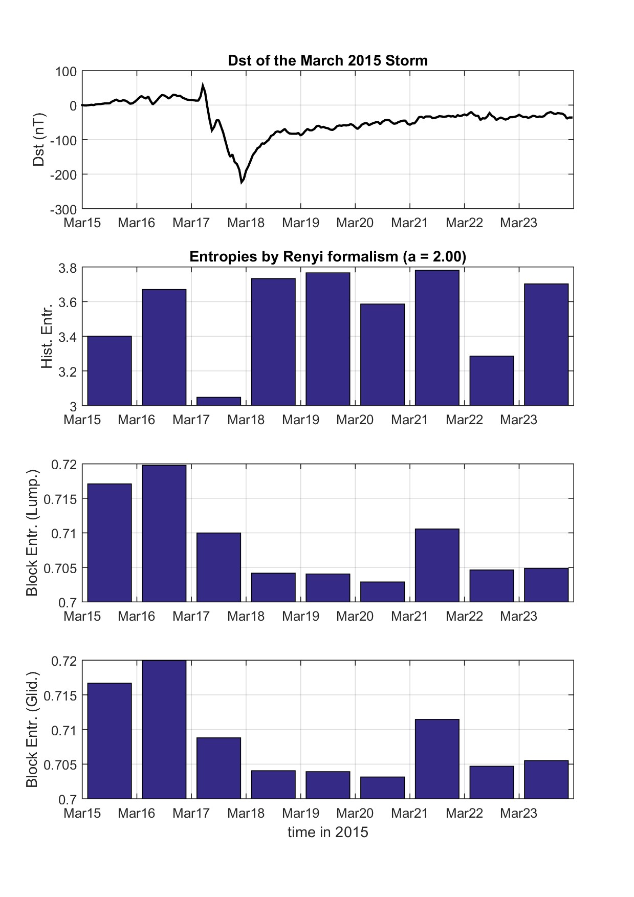 | INTENS_SwarmB_Storm2_Dst-like_Renyi.JPG INTENS_SwarmB_Storm2_Dst-like_Renyi.ZIP | Entropy Analysis according to the Renyi formalism of the Swarm B Index for the March 2015 Magnetic Storm. The ASCII file "01" contains the timeseries of the Swarm B Dst-like index during the time interval which characterizes Storm N. 2.; ASCII files from "02" to "04" contain the daily averaged values of Renyi Entropy and Block entropies associated to the Dst-like index. |