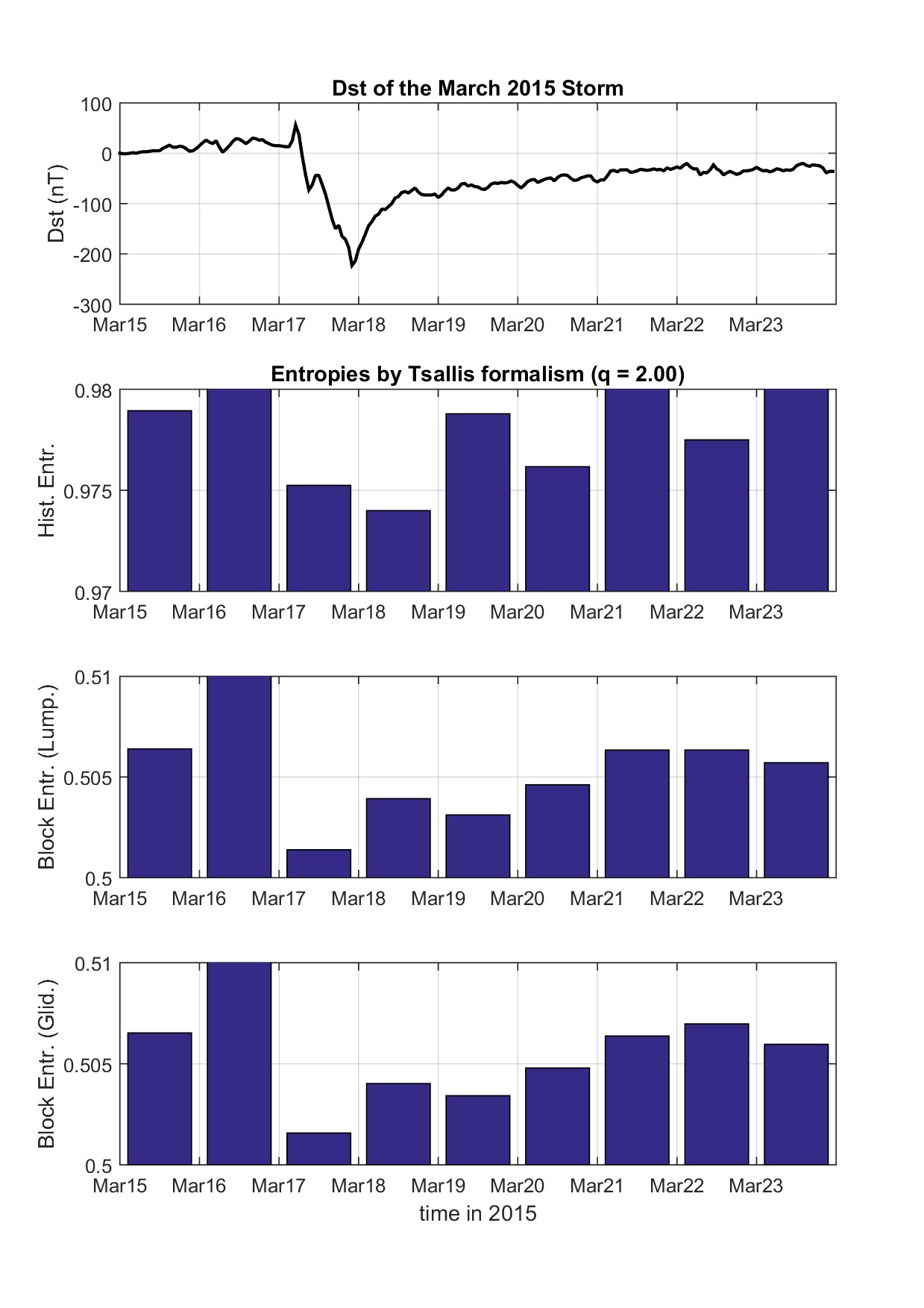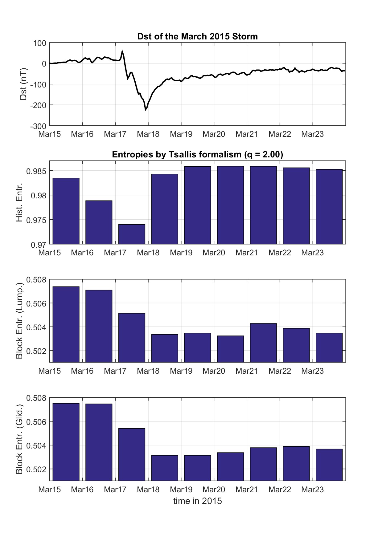 | INTENS_SwarmB_Storm2_Bper2_Tsallis.JPG INTENS_SwarmB_Storm2_Bper2_Tsallis.ZIP | Entropy Analysis according to the Tsallis formalism of the Swarm B Bper2 for the March 2015 Magnetic Storm. The ASCII file "01" contains the timeseries of the official Dst hourly index during the time interval which characterizes Storm N. 2.; ASCII files from "02" to "04" contain the daily averaged values of Tsallis Entropy and Block entropies associated to the Swarm B Bper2 component. |